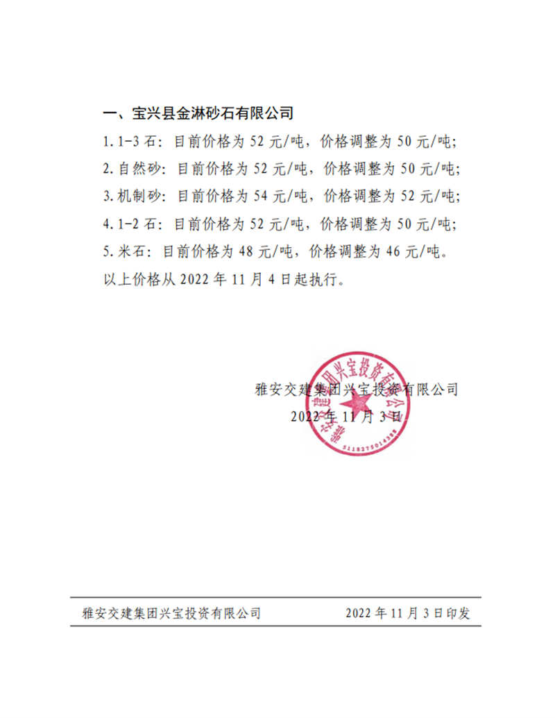 雅交建兴宝〔2022〕44号 关于调整砂石成品料销售价格的通知10.17