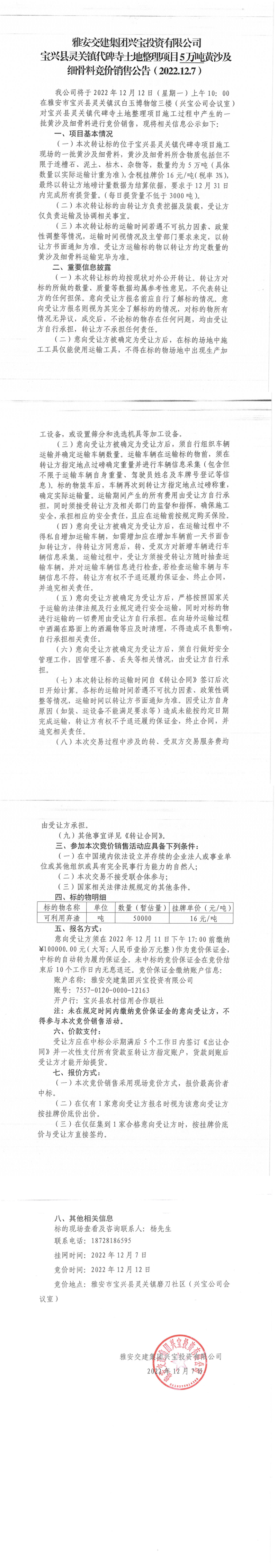 米兰体育-米兰(中国)官网 兴宝投资有限公司宝兴县灵关镇代碑寺土地整理项目5万吨黄沙及细骨料竞价销售成交公告(2022-12-12)