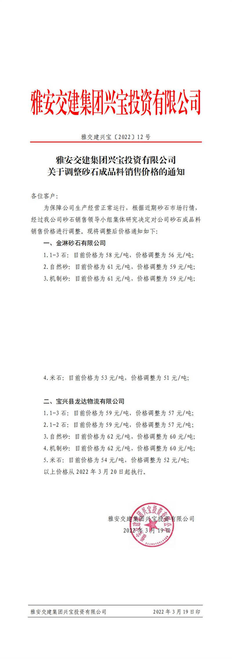 雅交建兴宝〔2022〕12号 关于调整砂石成品料销售价格的通知3月19日