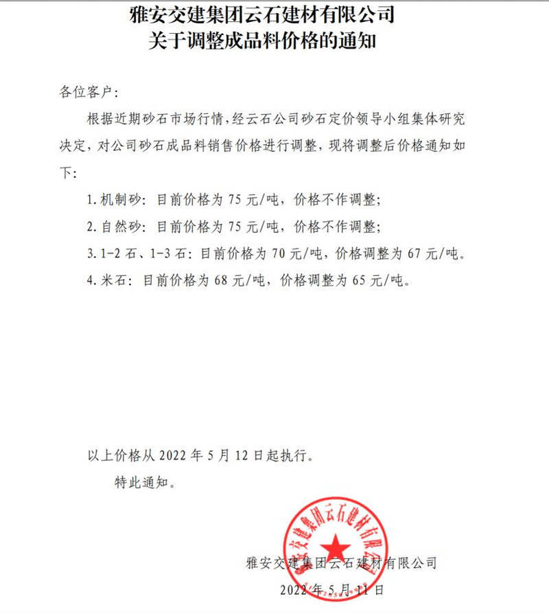 雅安交建云石建材有限公司调价通知-2022-5-12