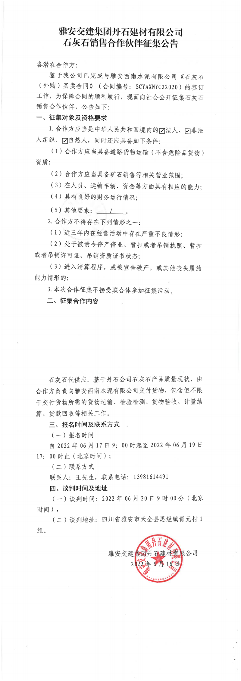 米兰体育-米兰(中国)官网 丹石建材有限公司石灰石销售合作伙伴征集公告6-16