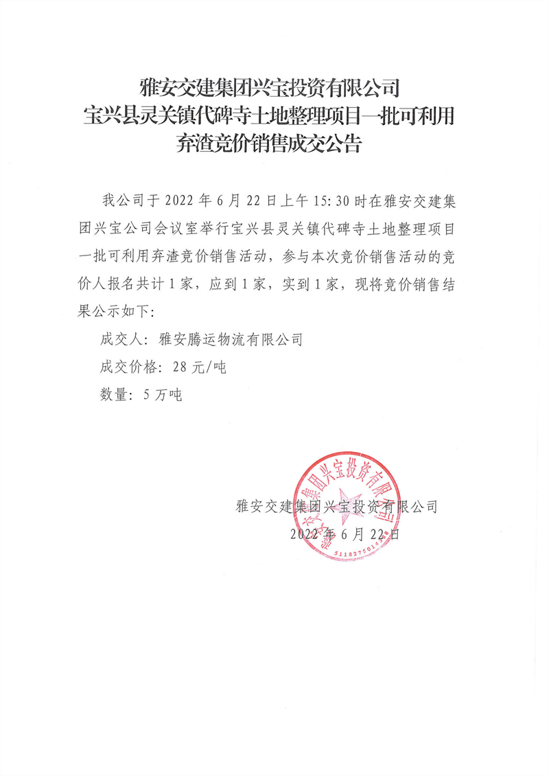 宝兴县灵关镇代碑寺土地整理项目可利用弃渣成交公告