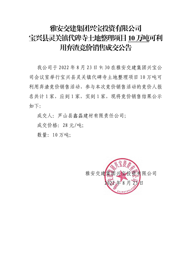 米兰体育-米兰(中国)官网 兴宝投资有限公司宝兴县灵关镇代碑寺土地整理项目10万吨可利用弃渣竞价销售成交公告(8.23)