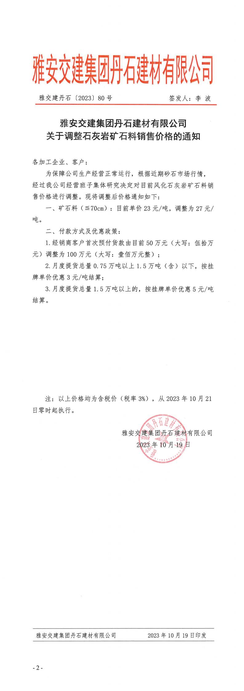 雅安交建丹石公司关于石灰岩矿石料调价的通知--2023.10.20