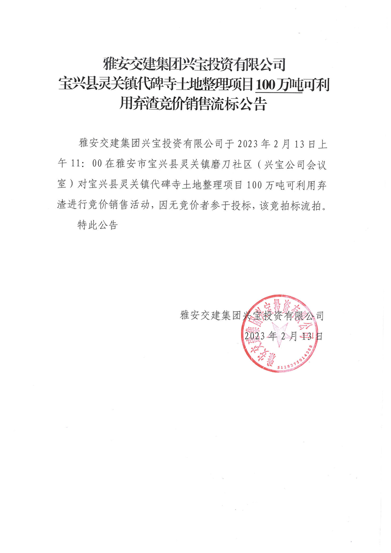 米兰体育-米兰(中国)官网 兴宝投资有限公司100万吨可利用弃渣竞价销售流标公告(2023.2.13)