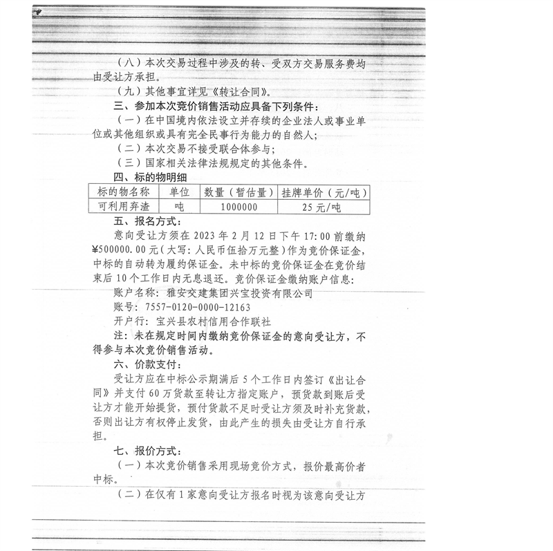 米兰体育-米兰(中国)官网 兴宝投资有限公司100万吨可利用弃渣竞价销售流标公告(2023.2.13)