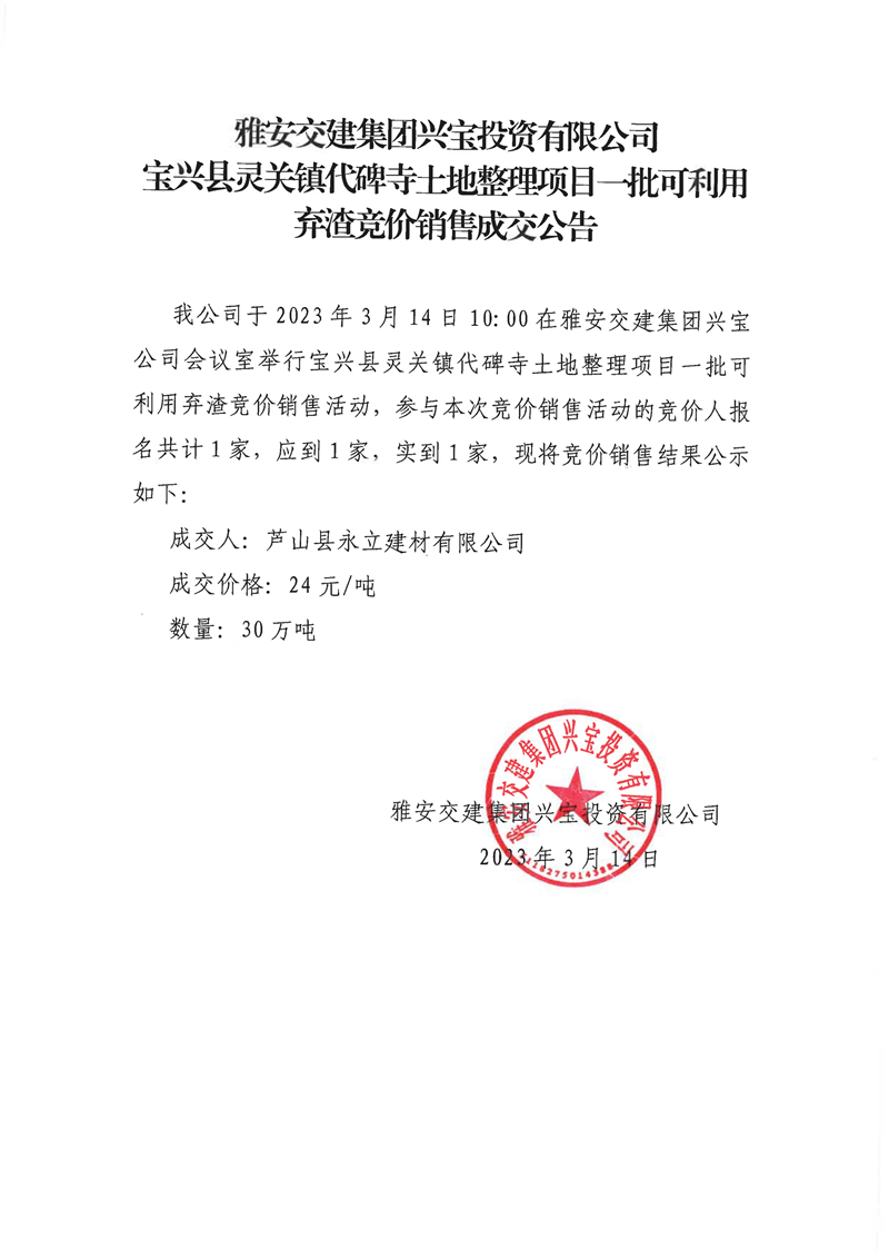 米兰体育-米兰(中国)官网 兴宝投资有限公司灵关镇代碑寺土地整理项目30万吨可利用弃渣竞价销售成交公告(2023.3.20)
