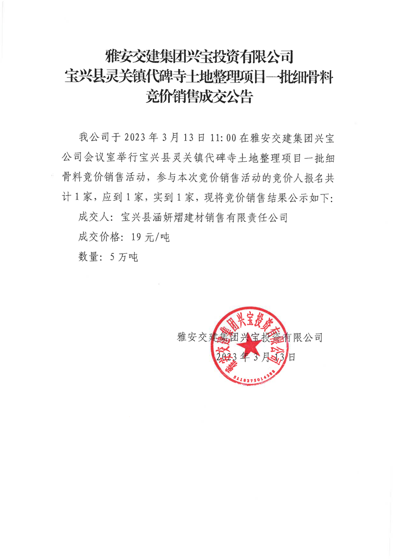 米兰体育-米兰(中国)官网 兴宝投资有限公司30万吨可利用弃渣竞价销售成交公告、5万吨细骨料竟价成效公告(2023.3.14)