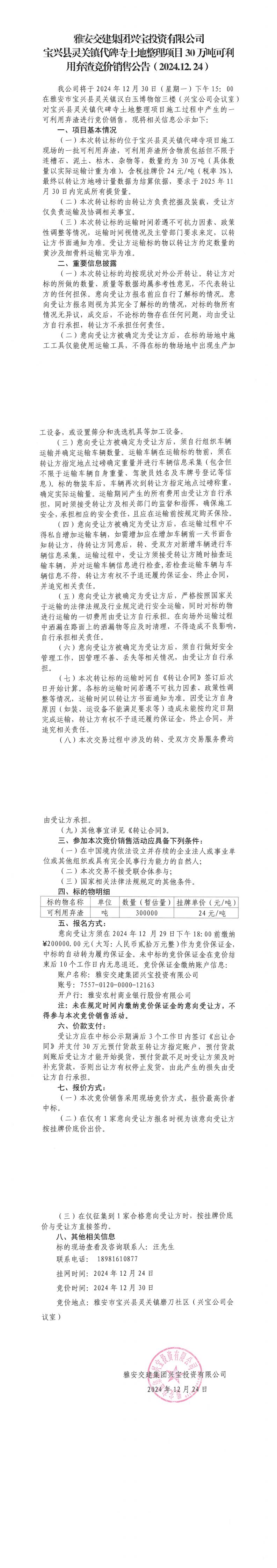 米兰体育-米兰(中国)官网 兴宝投资有限公司灵关镇代碑寺土地整理项目10万吨可利用弃渣竞价销售公告(2024.12.24)