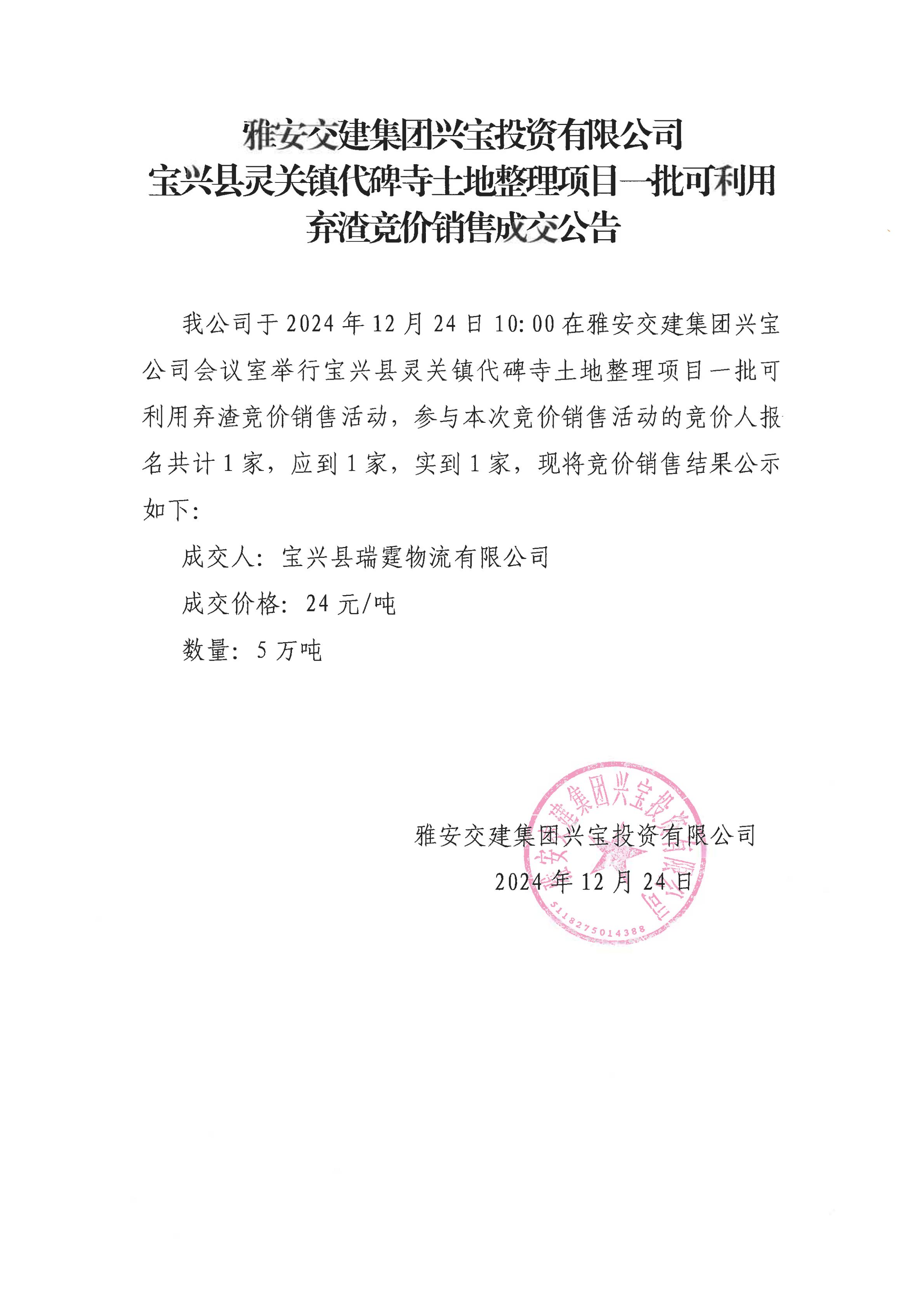 米兰体育-米兰(中国)官网 兴宝投资有限公司灵关镇代碑寺土地整理项目5万吨可利用弃渣成交公告(2024.12.24)