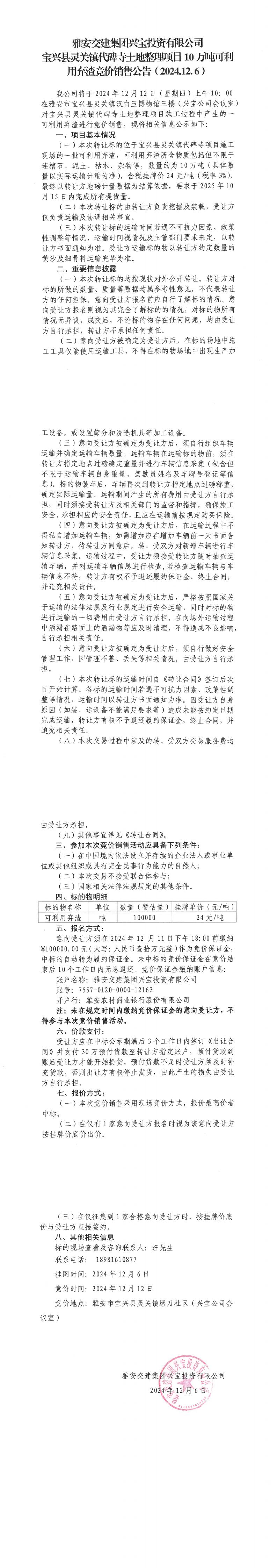 米兰体育-米兰(中国)官网 兴宝投资有限公司灵关镇代碑寺土地整理项目10万吨可利用弃渣竞价销售公告(2024.12.06)