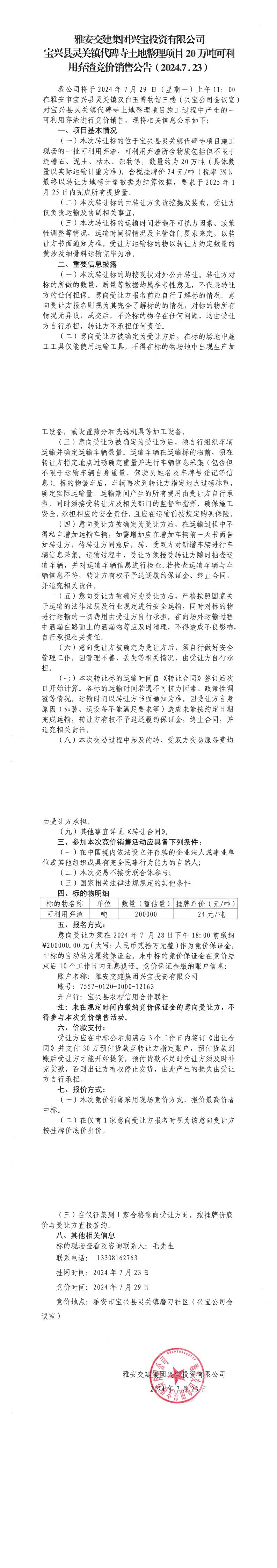 米兰体育-米兰(中国)官网 兴宝投资有限公司灵关镇代碑寺土地整理项目20万吨可利用弃渣竞价销售公告(2024.7.23)