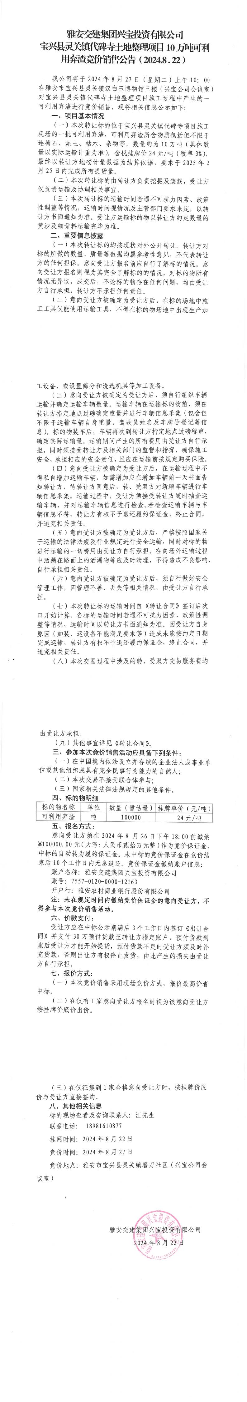 米兰体育-米兰(中国)官网 兴宝投资有限公司宝兴县灵关镇代碑寺土地整理项目10万吨可利用弃渣竞价销售公告(2024-8-22)_0