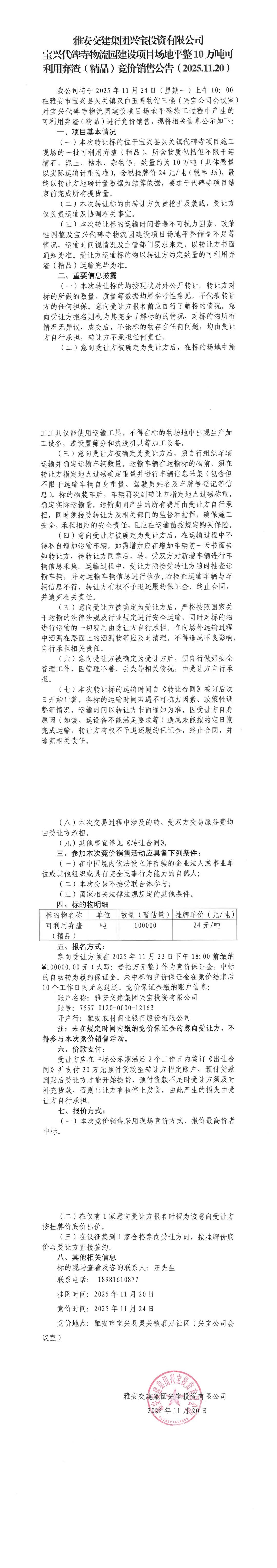 米兰体育-米兰(中国)官网 兴宝投资有限公司宝兴代碑寺物流园建设项目场地平整10万吨可利用弃渣(精品)竞价销售公告(2025.11.20)