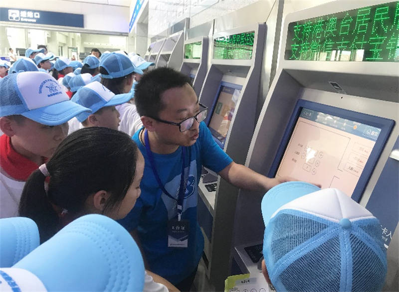 在雅安火车站行政办公楼旁的操场上,运通公司工作人员就雅安火车站相关情况向孩子们进行了简单介绍,对孩子们提出的问题进行了一一解答。下午4点13分,伴随响亮的鸣笛声,一辆动车驶出站台,孩子们欢呼雀跃,兴奋不已。在雅安火车站售票大厅,运通公司员工向孩子们讲解了自助购、取票操作流程。