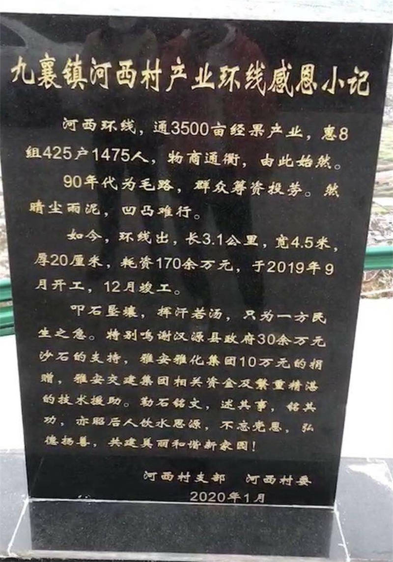 近期,汉源县九襄镇河西村勒石铭文,撰写“九襄镇河西村产业环线感恩小记”,以纪念该村水泥环线公路竣工通车。