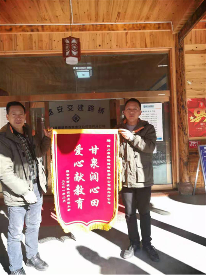 2月19日,雅安市雨城区第四小学汉碑校区将一面绣有“甘泉润心田、爱心献教育 ”的锦旗送到交建路桥公司宝兴项目部,感谢路桥公司向汉碑校区捐赠5万元基金用以建设该校劳动教育烹饪基地。