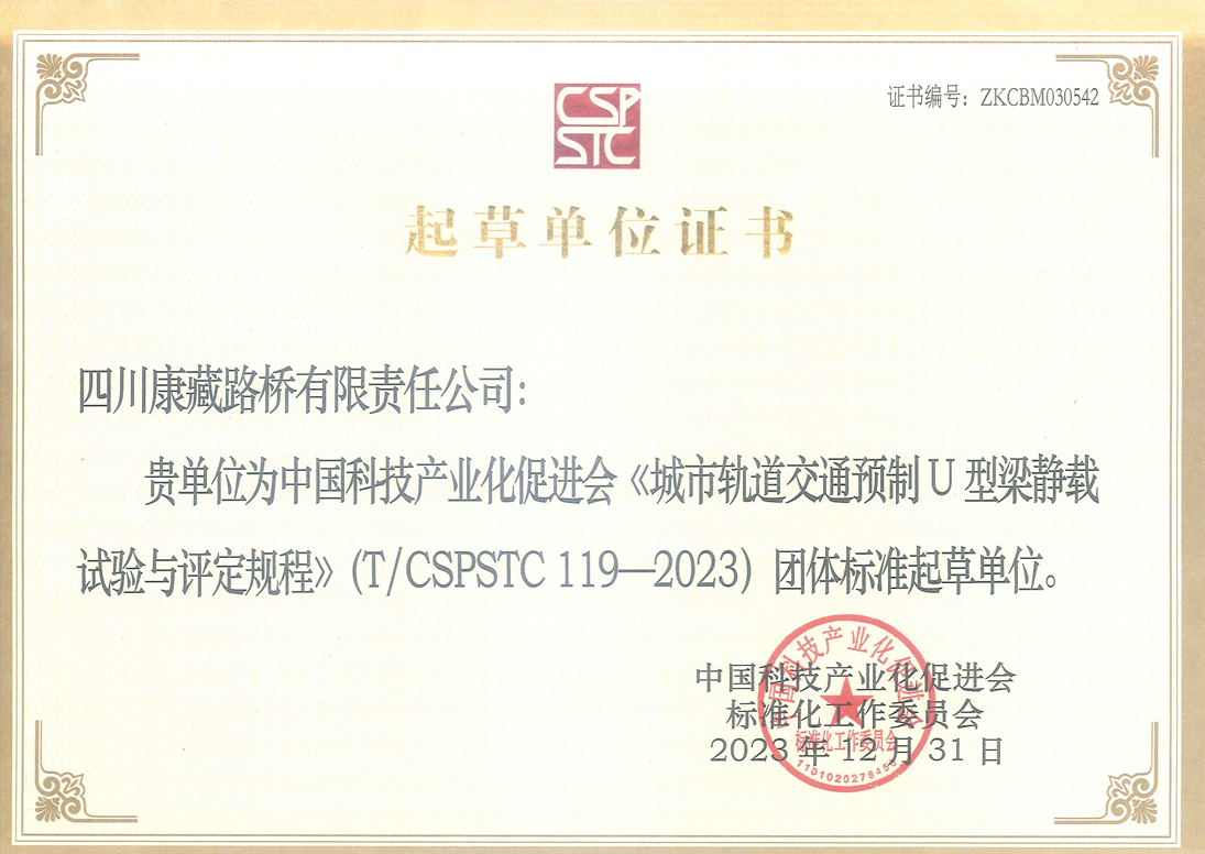 收到中国科技产业化促进会颁发的《城市轨道交通预制U型梁静载试验与评定规程》(T/CSPSTC119-2023)团体标准起草单位证书,路桥公司参与起草的《城市轨道交通预制U型梁静载试验与评定规程》团体标准,于2023年12月31日正式发布实施。