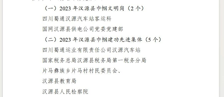 蜀通汉源汽车站被汉源县妇联评为“2023年汉源县巾帼建工先进集体”、“2023年汉源县巾帼文明岗”。