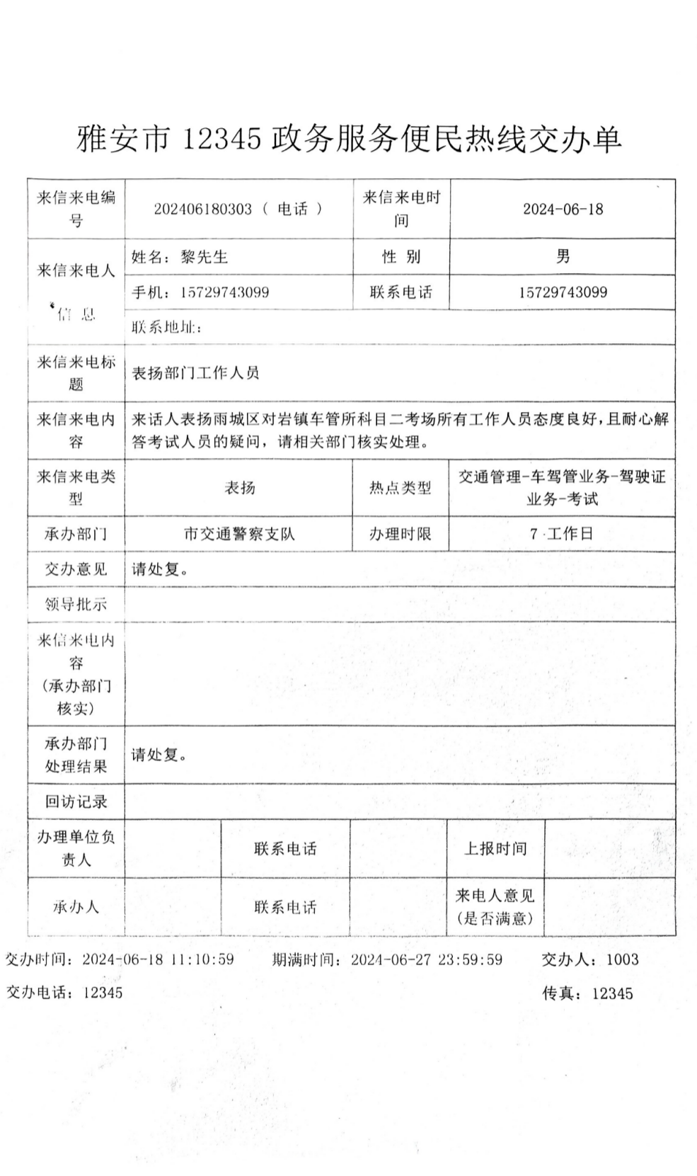 2024年6月18日,平顺公司收到一封特殊的来信,市民黎先生通过“12345”政务服务便民热线“...表扬科目二考场所有工作人员态度良好,且耐心解答考试人员的疑问...”。字里行间表达了对我公司科目二所有工作人员工作的满意和认可。 平顺公司一直不忘“勤廉为本,服务至上”的理念,狠抓服务、专业过硬。这封感谢信不仅是荣誉,更是一份责任,我公司将以群众的认可为动力,继续以更优质的服务和更专业的技术服务每一位驾考朋友。