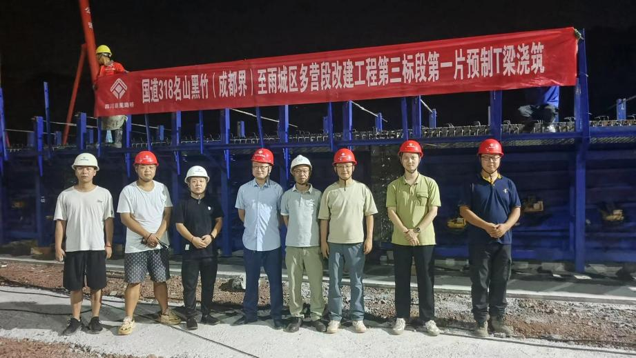 国道318名山区黑竹(成都界)至雨城区多营段改建工程三标段首片预制T梁成功浇筑。