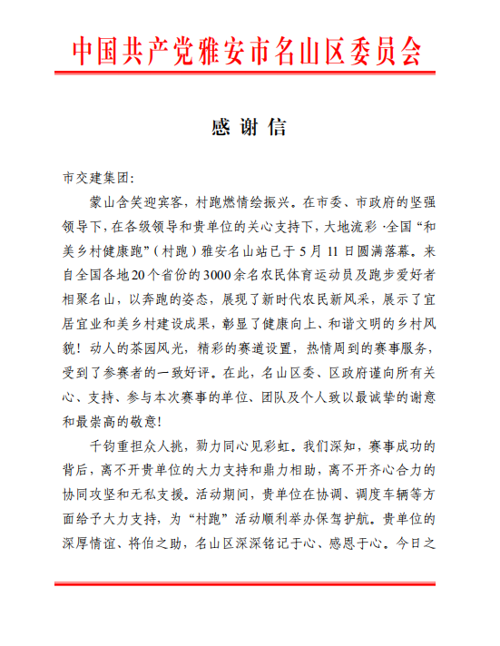5月10日至11日,以“心向和美 逐梦茶源”为主题的大地流彩·2025年全国和美乡村健康跑(村跑)雅安名山站活动在雅安市名山区成功举办。四川蜀通运业有限责任公司作为运输保障单位,圆满完成赛事期间各项运输保障任务,为活动的顺利开展提供了坚实保障,受到名山区委、区政府感谢信。