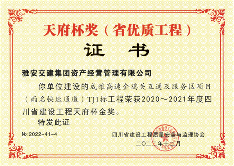 资产经营管理有限公司建设的成雅高速金鸡关互通及服务区项目(雨名快速通道)TJ1标工程荣获2020-2021年度四川省建设工程天府杯金奖。