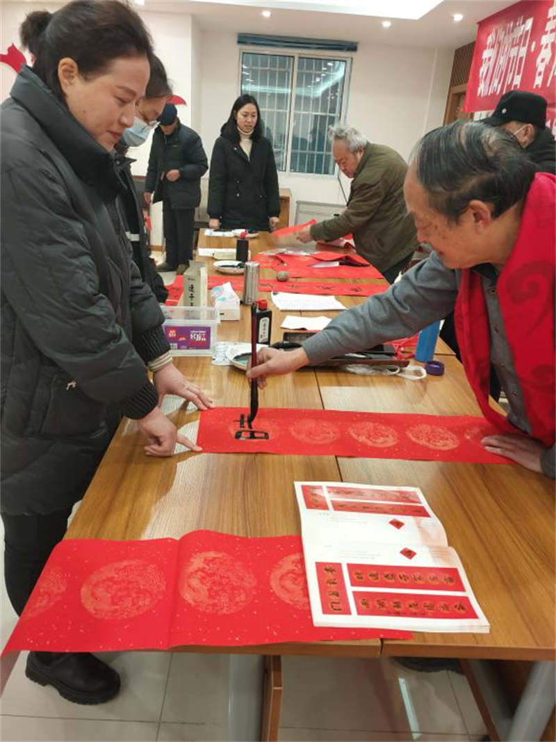 活动现场,翰墨飘香,春意融融,呈现出一派吉祥喜庆的新春景象。书法家们挥毫泼墨,运笔如飞,为居民写春联、送福字,一幅幅寓意吉祥的春联相继出炉,一幅幅充满了吉祥祝福和浓浓年味的手写春联送到居民手中,为即将来临的春节增添了浓浓的喜庆氛围。居民们拿着红红的春联,脸上洋溢着幸福的笑容,整个现场被红色的春联和热闹的人群烘托得年味十足。吹响新春“集结号”,服务群众“零距离”。