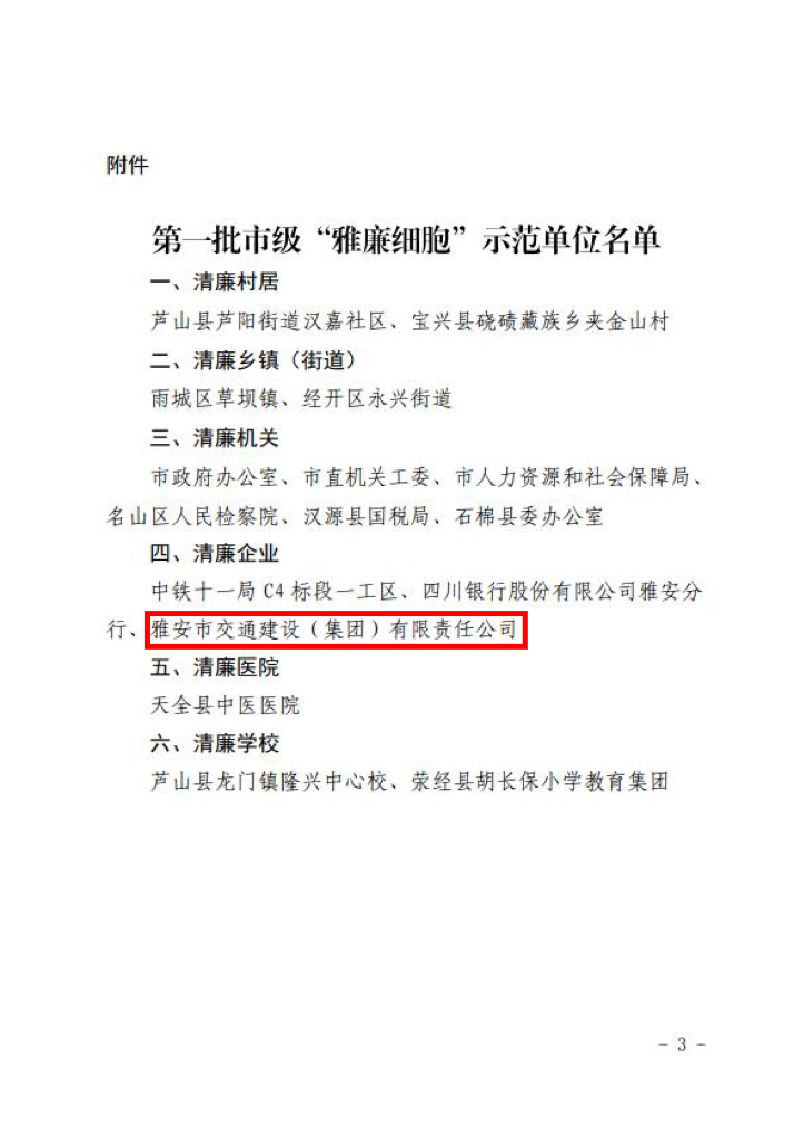 经过雅安市党风廉政建设责任制领导小组办公室严格考评审定,米兰体育-米兰(中国)官网 被命名为第一批市级“雅廉细胞”示范单位(清廉企业)。