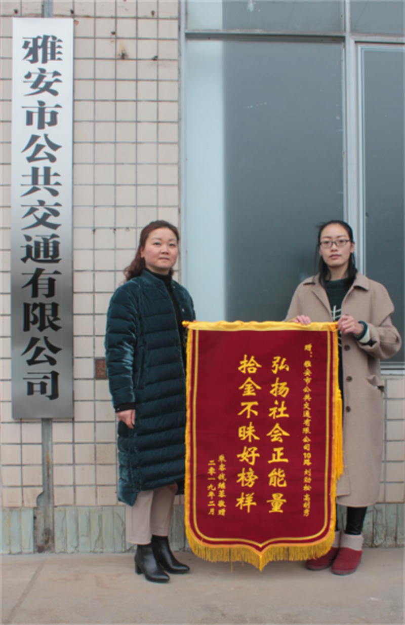 “请一定把我们的感谢带给驾驶员和发班员。”2月14日下午17时15分左右,一名手拿写着“拾金不昧好榜样弘扬社会正能量”锦旗的市民钱续露来到雅安市公共交通有限公司,将锦旗送到了经理助理方媛手上,请她把感谢之意转达给10路公交车驾驶员刘进松和发班员高胡秀。