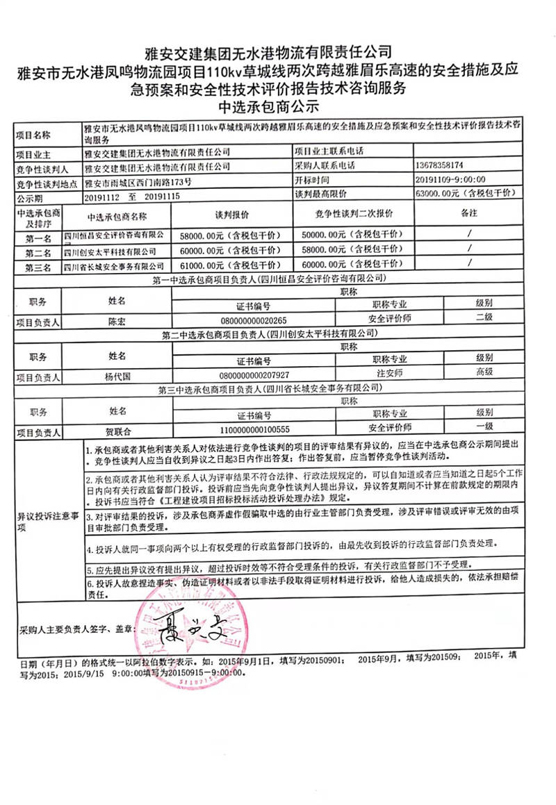 米兰体育-米兰(中国)官网 无水港物流有限责任公司雅安市无水港凤鸣物流园项目110kv草城线两次跨越雅眉乐高速的安全措施、应急预案以及安全性技术评价报告技术咨询服务中选承包商公示