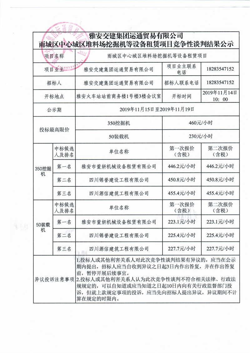 米兰体育-米兰(中国)官网 运通贸易有限公司雨城区中心城区堆料场挖掘机等设备租赁项目竞争性谈判结果公示
