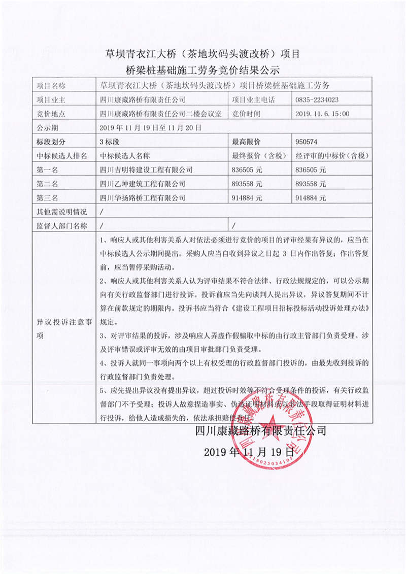 四川康藏路桥有限责任公司草坝青衣江大桥(茶地坎码头渡改桥)项目桥梁桩基础施工劳务竞价(3标段)结果公示
