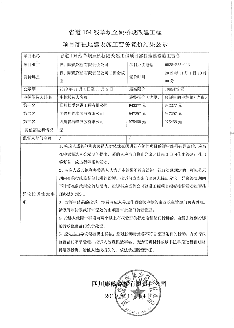 四川康藏路桥有限责任公司省道104线草坝至姚桥段改建工程项目部驻地建设施工劳务竞价结果公示