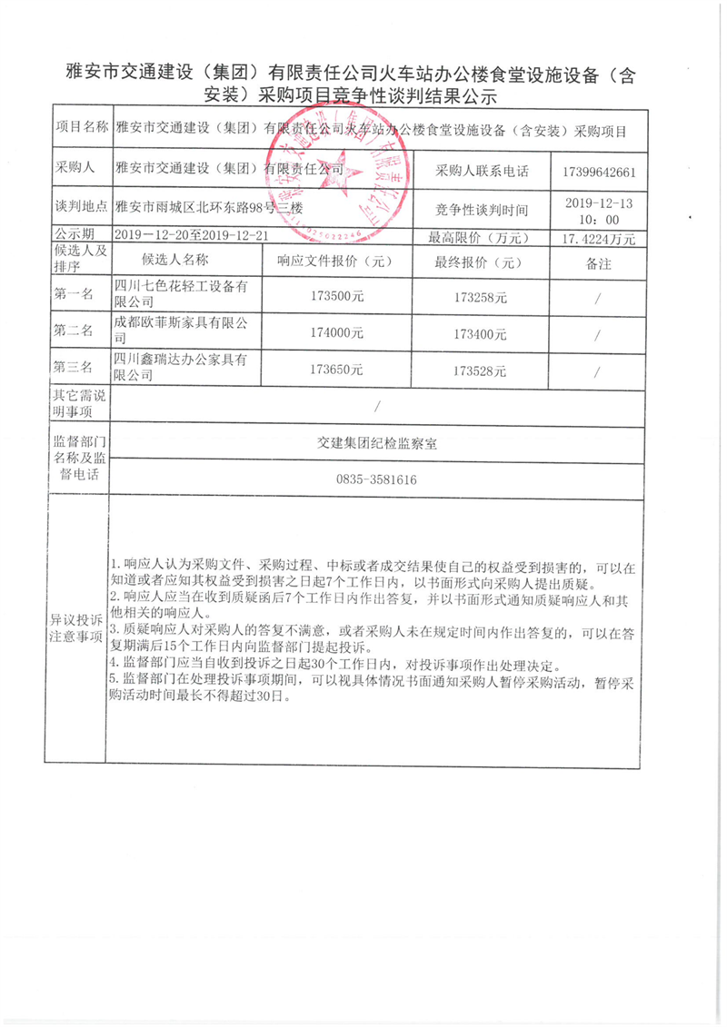 米兰体育-米兰(中国)官网 火车站办公楼食堂设施设备(含安装)采购项目竞争性谈判结果公示