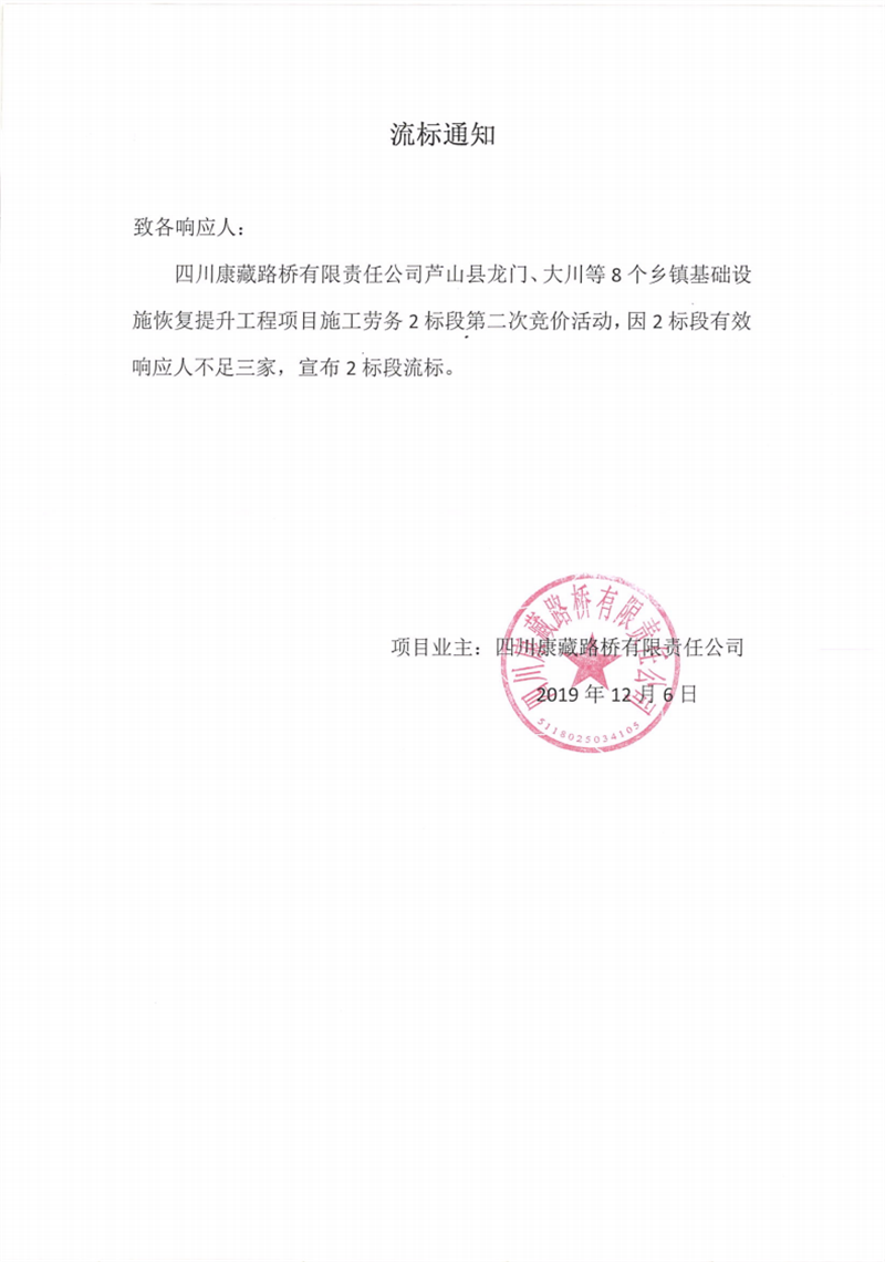 四川康藏路桥有限责任公司芦山县龙门、大川等8个乡镇基础设施恢复提升工程项目施工劳务2标段第二次竞价流标通知