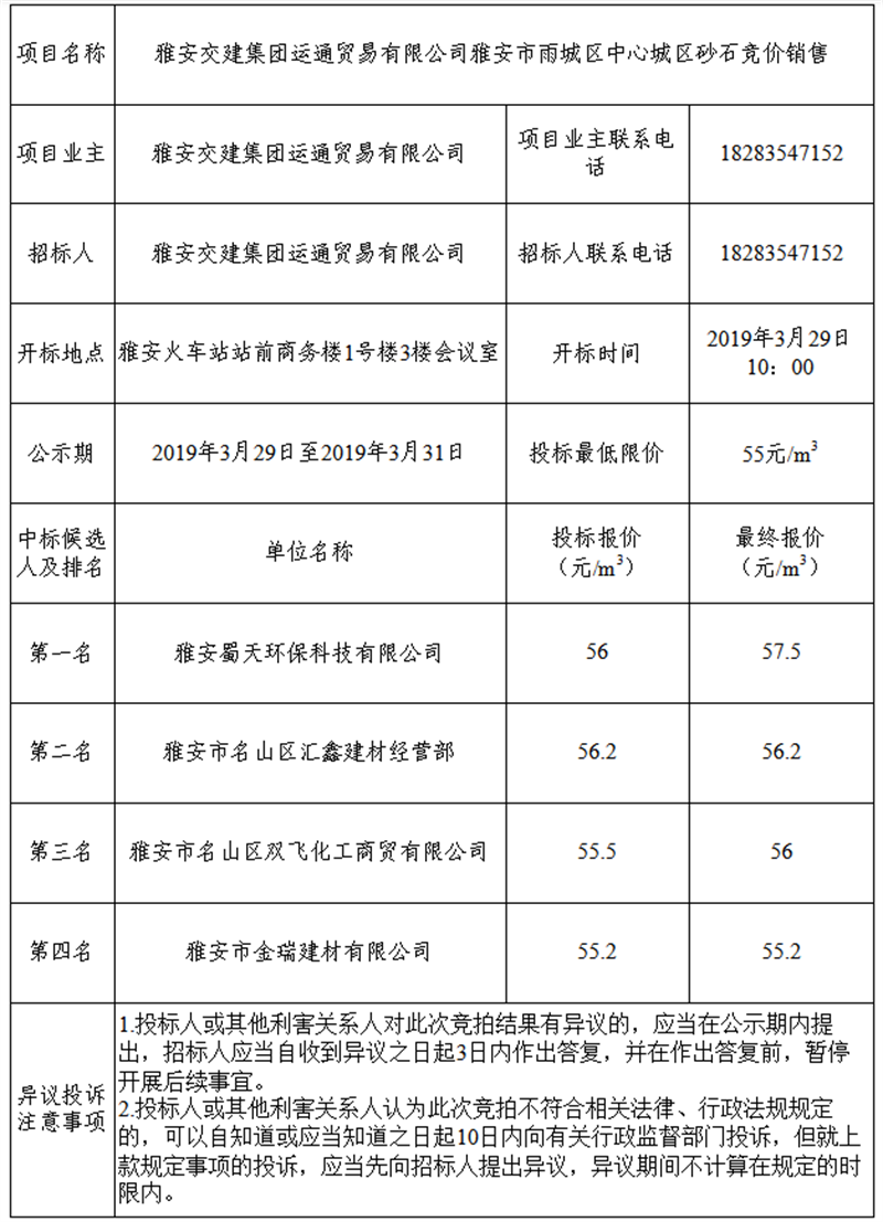 米兰体育-米兰(中国)官网 运通贸易有限公司关于雅安市雨城区中心城区砂石竞拍结果公示