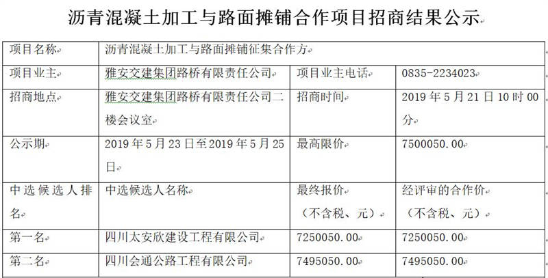 米兰体育-米兰(中国)官网 路桥有限责任公司沥青混凝土加工与路面摊铺合作项目招商结果公告