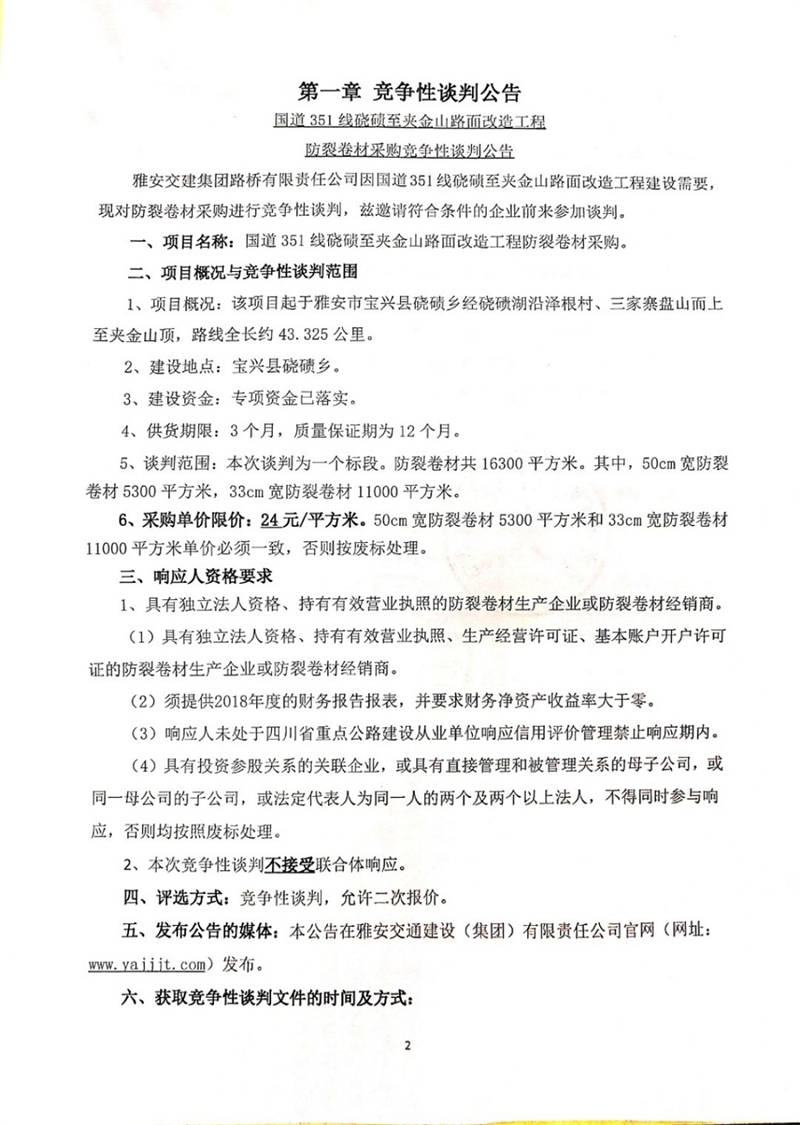 米兰体育-米兰(中国)官网 路桥有限责任公司国道351线硗碛至夹金山路面改造工程防裂卷材采购竞争性谈判公告