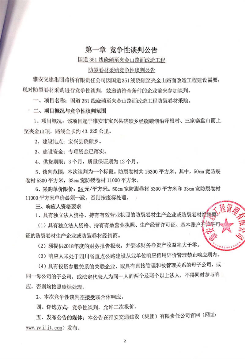 米兰体育-米兰(中国)官网 路桥有限责任公司国道351线硗碛至夹金山路面改造工程防裂卷材采购竞争性谈判公告