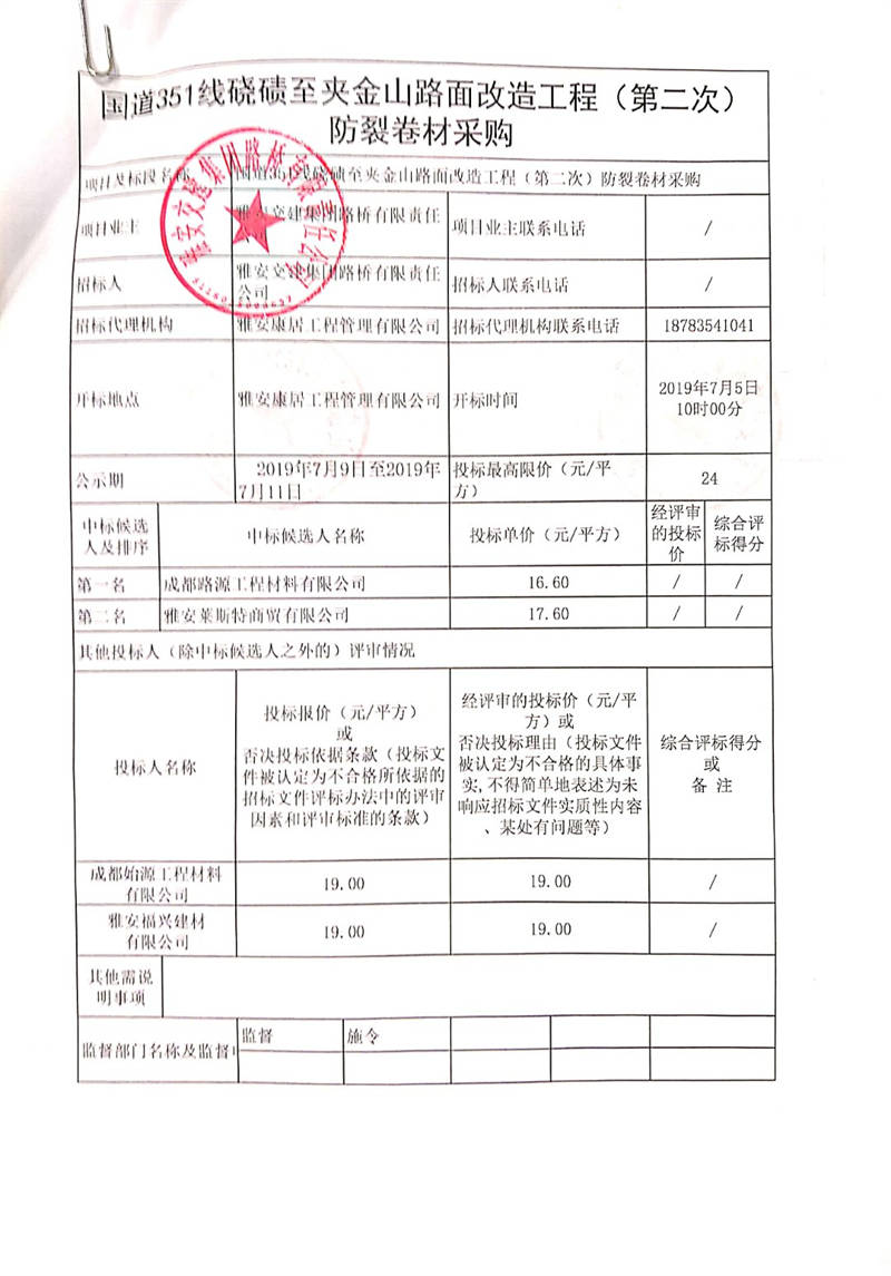 米兰体育-米兰(中国)官网 路桥有限责任公司国道351线硗碛至夹金山路面改造工程(第二次)防裂卷材采购竞争性谈判结果公示