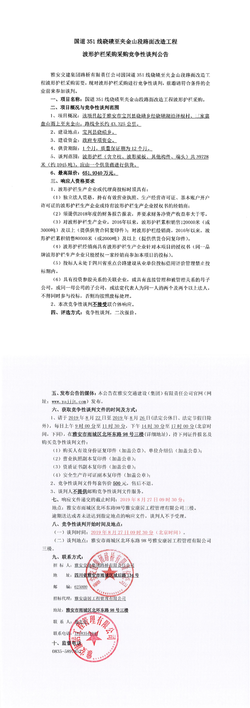 米兰体育-米兰(中国)官网 路桥有限责任公司国道351线硗碛至夹金山段路面改造工程波形护栏采购项目竞争性谈判公告