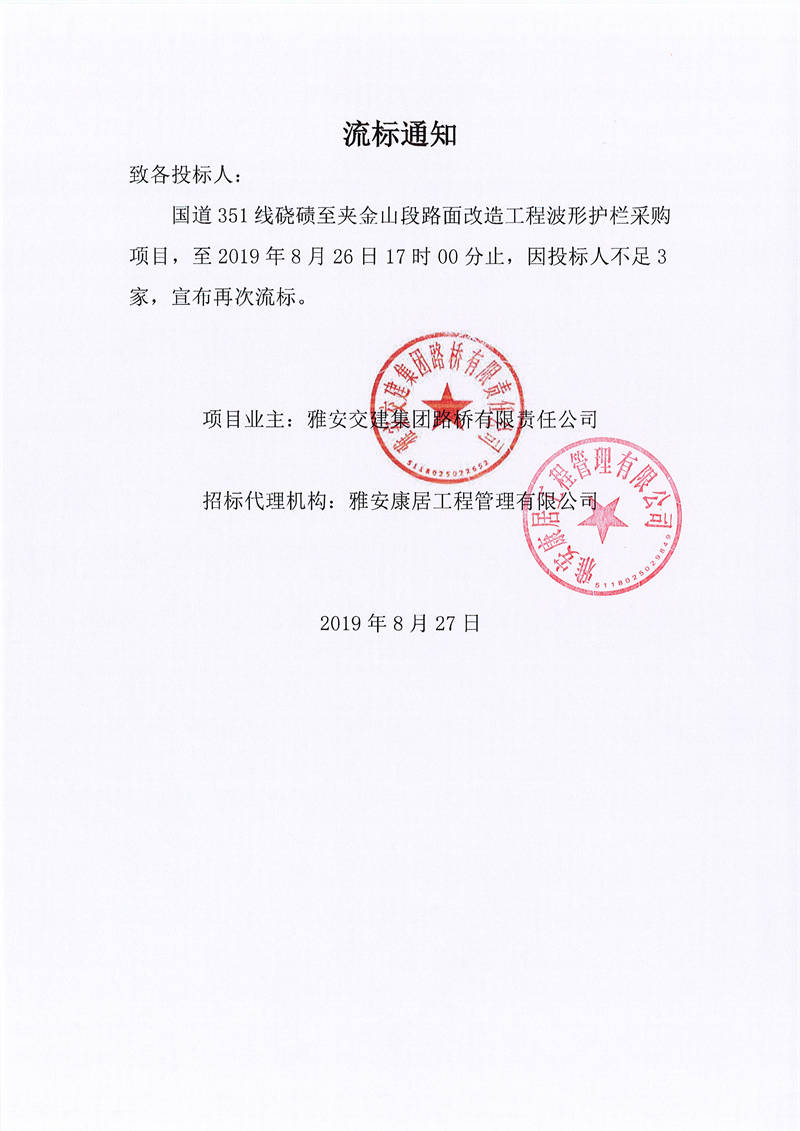 米兰体育-米兰(中国)官网 路桥有限责任公司国道351线跷碛至夹金山段路面改造工程波形护栏采购项目流标通知