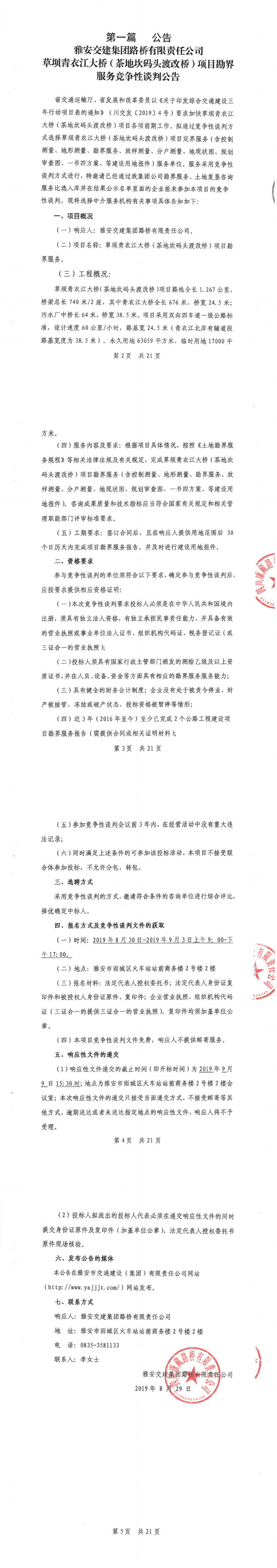 米兰体育-米兰(中国)官网 路桥有限责任公司草坝青衣江大桥(茶地坎码头渡改桥)项目勘界服务竞争性谈判公告