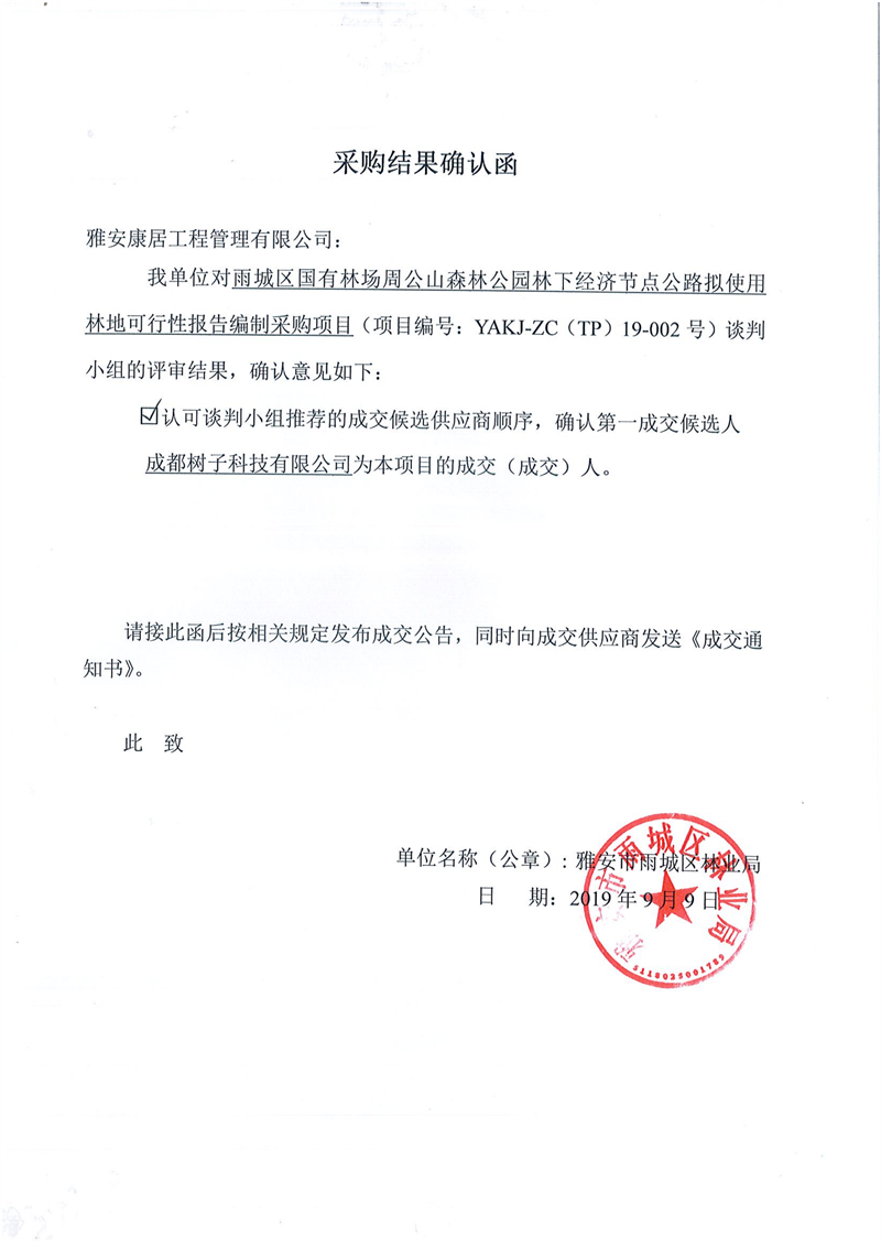 雅安市雨城区林业局雨城区国有林场周公山森林公园林下经济节点公路拟使用林地可行性报告编制采购项目竞争性谈判结果公示