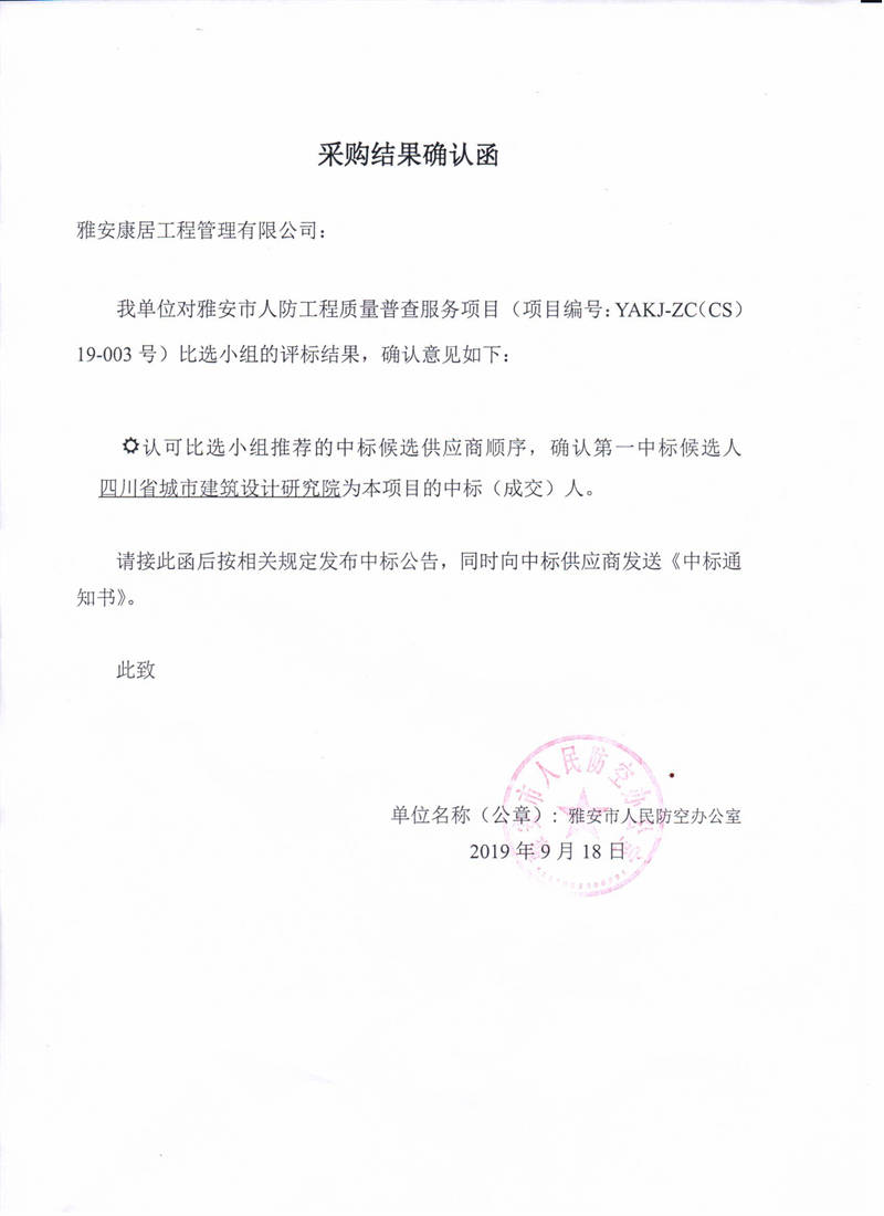 雅安市人民防空办公室雅安市人防工程质量普查服务项目评标结果公示