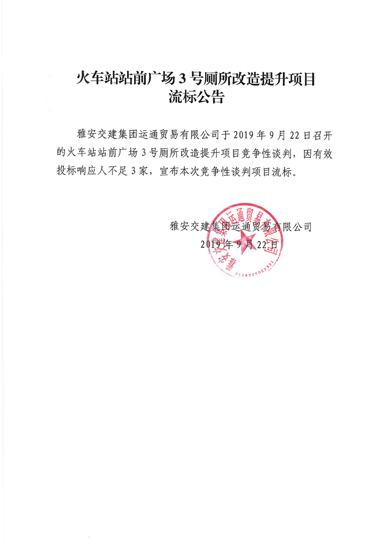 米兰体育-米兰(中国)官网 运通贸易有限公司火车站站前广场3号厕所改造提升项目流标公告