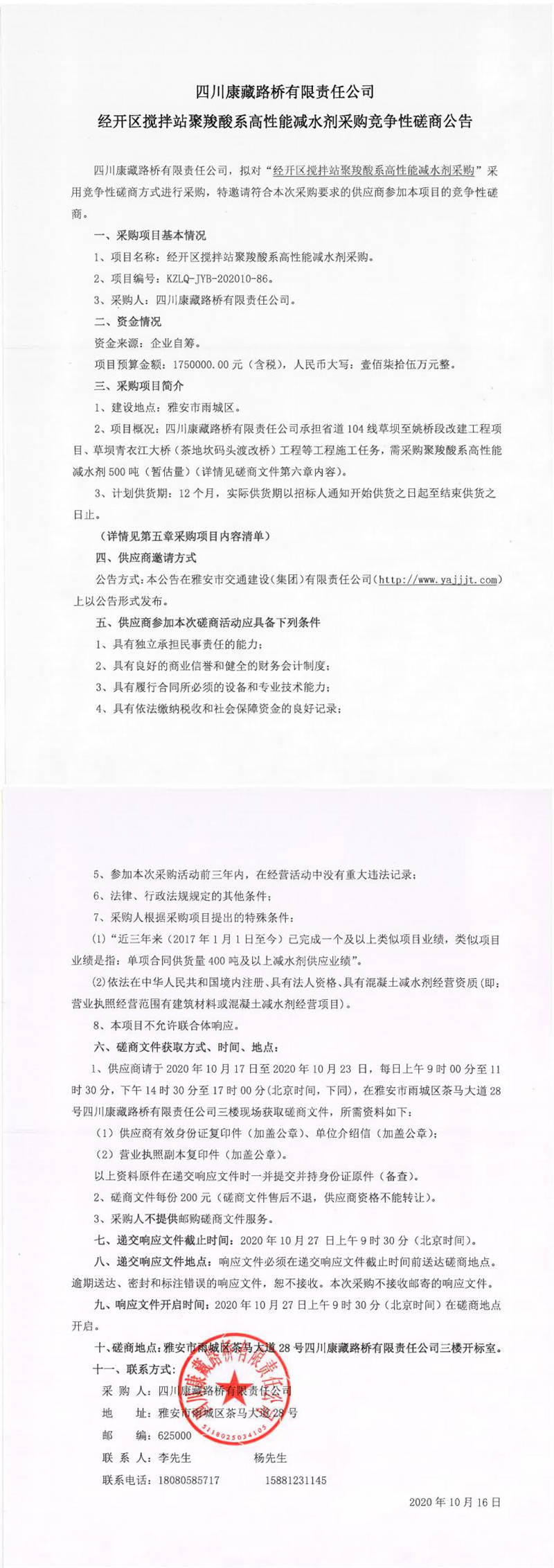 四川康藏路桥有限责任公司经开区搅拌站聚羧酸系高性能减水剂采购竞争性磋商公告