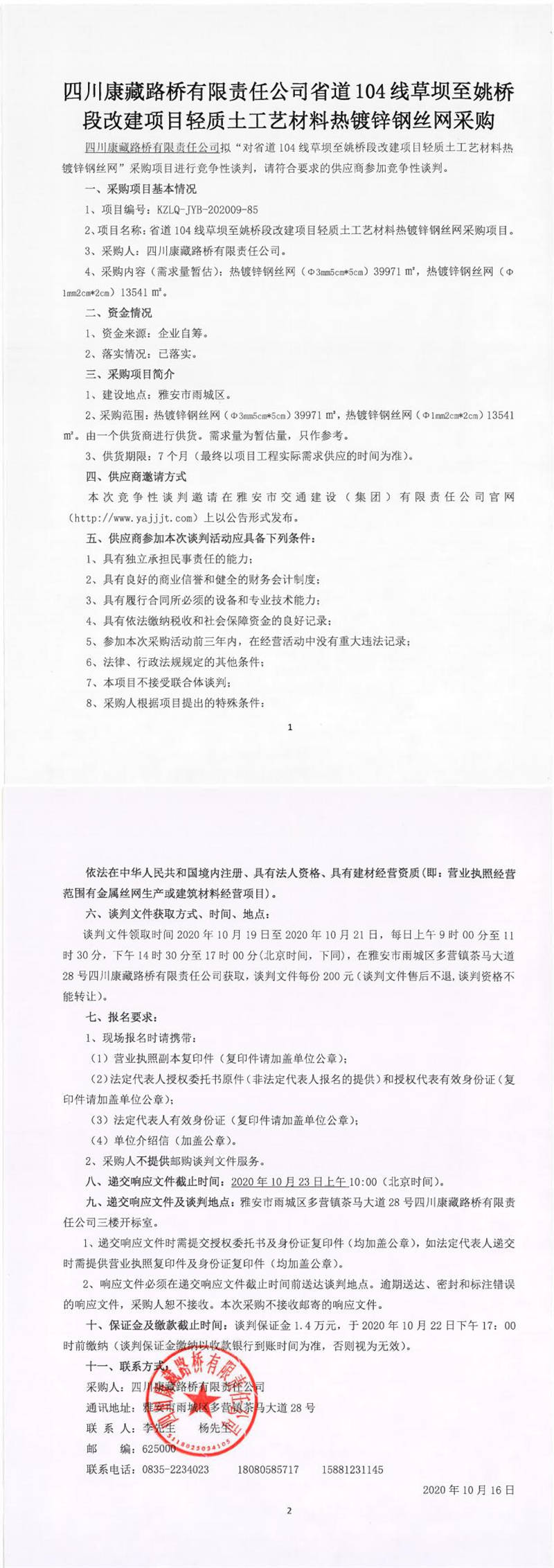 四川康藏路桥有限责任公司省道104线草坝至姚桥段改建项目轻质土工艺材料热镀锌钢丝网采购竞争性谈判公告