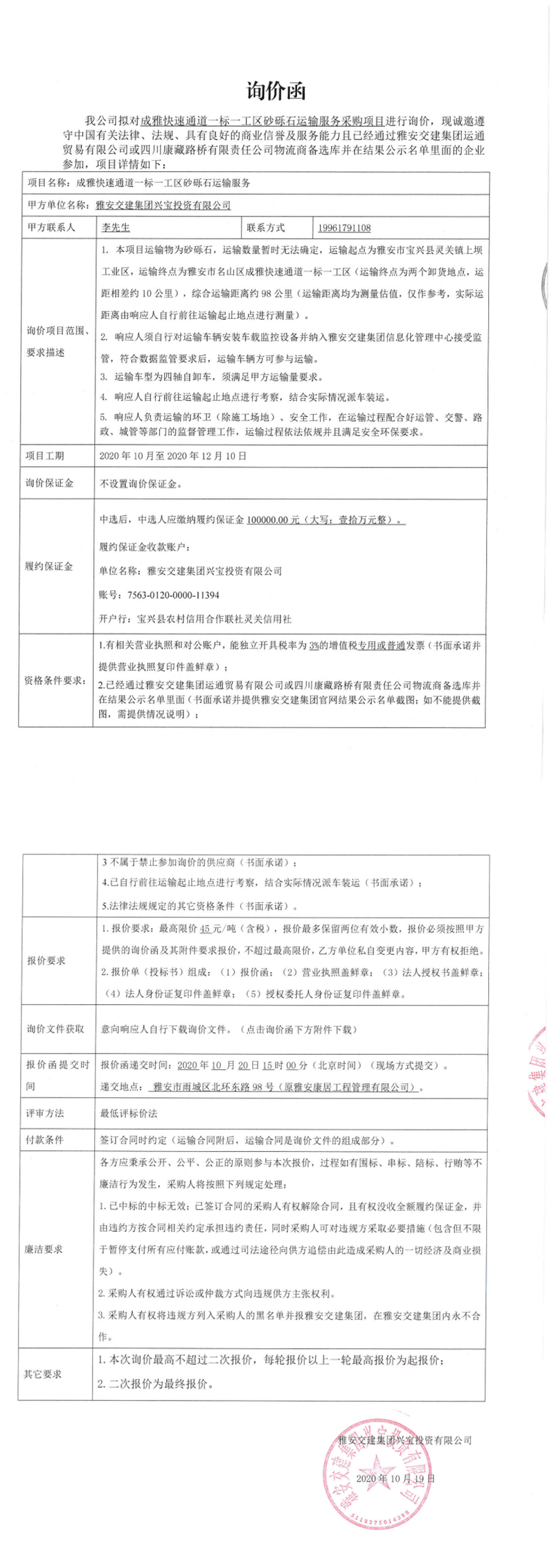 米兰体育-米兰(中国)官网 兴宝投资有限公司成雅快速通道一标一工区砂砾石运输服务采购项目询价函